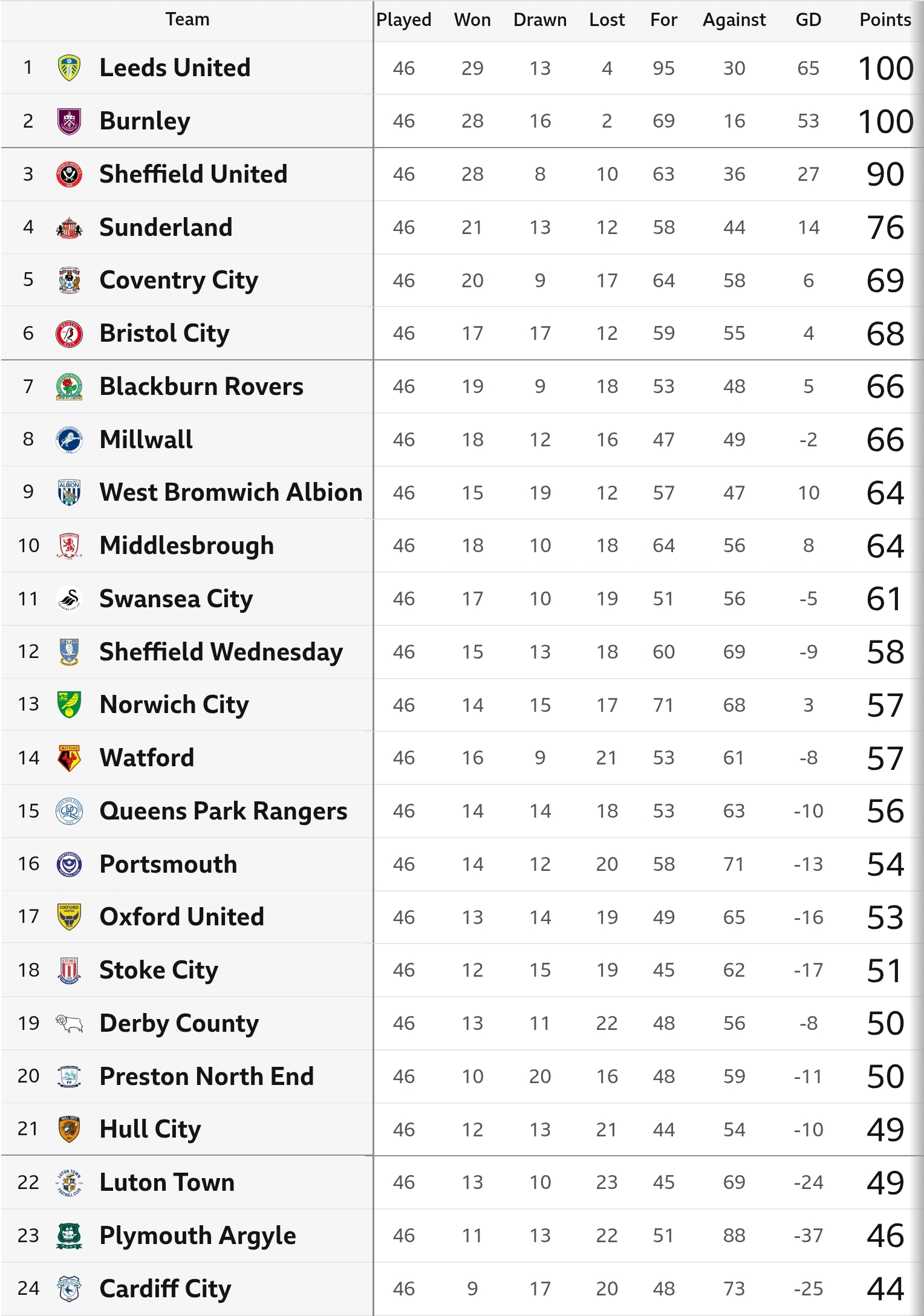 To its credit, the model accurately predicted Leeds United as champions of the Championship, and correctly placed Cardiff City and Plymouth Argyle at the bottom of the table.