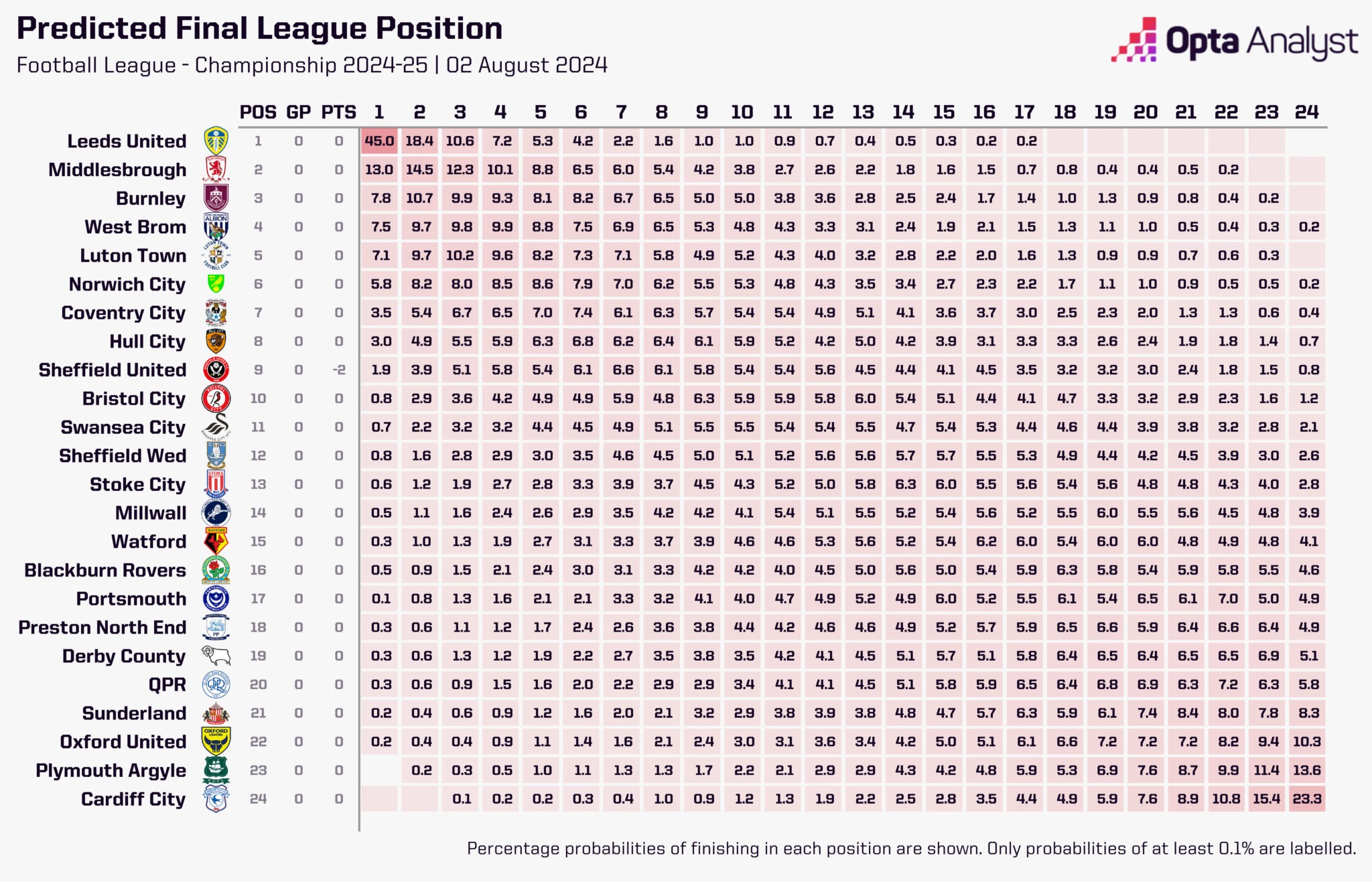 Before the season kicked off, Opta’s supercomputer ran 10,000 simulations to predict where each of the 24 teams might finish by the campaign’s conclusion.